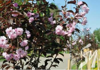А на розі вул. Гончої та Шевченка (біля музичної школи, де розташована клумба у вигляді білосніжного роялю) зацвіло ще одне надзвичайно мальовниче деревце – слива Піссарді (в народі її називають червонолистяною аличею). Цей вид дуже широко використовується в озелененні, тому що виглядає привабливо: навесні рясніє темно-рожевим квітом, влітку має червоно-рожеві плоди, а восени вкривається яскравим листям.