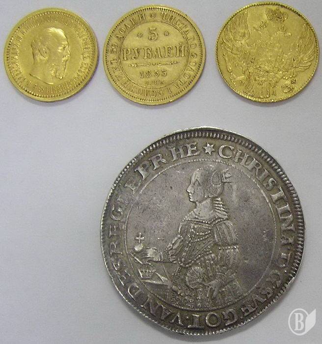 Це монети номіналом: «5 рублей» 1889 року (Російська імперія, Олександр ІІІ), «5 рублей» 1853 та 1836 років (Російська імперія, Микола І), «2 рубля» 1756 року (Російська імперія, Єлізавета І), «талер» Королівства Швеції 1639 року (Ризький монетний двір, королева Христина Ваза), 2 монети «3 рубли на серебро» 1833 та 1843 років (Російська імперія, Микола І).