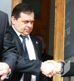 На фото: Олександр Михайлик здоровається з мером Олександром Соколовим. Суворий погляд Михайлика говорить про деякі претензії головного міліціонера області до мера Чернігова.