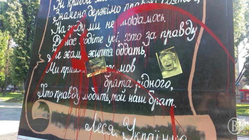Невідомі розмалювали червоною фарбою постамент, де раніше стояв Ленін. За схожим сценарієм вандали сплюндрували патріотичний паркан у районі магазину «Електрон».