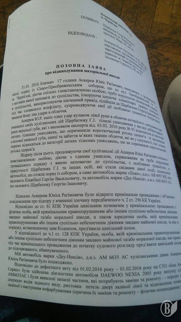 У Деснянському районному суді Чернігова почався розгляд справи за обвинуваченням волонтера та депутата Деснянської районної ради обласного центру Юніса Аскерова у побитті настоятеля Спасо-Преображенського собору УПЦ МП отця Георгія.