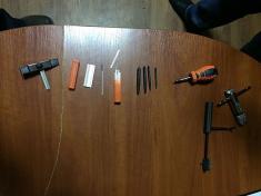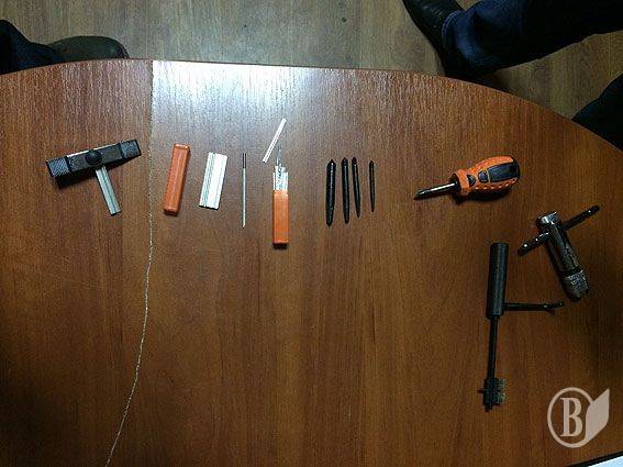 У ході подальшого особистого огляду у зловмисників виявлено та вилучено металевий кастет, мобільні телефони, 3000 доларів США та пристрій, за своїми зовнішніми ознаками схожий на алгоритмічний «Кодграббер» (сканер кодів автомобільної сигналізації), призначений для несанкціонованого втручання в роботу мережі електрозв’язку автомобільної сигналізації.