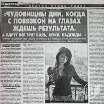 16-летней Алексии Юхименко из Николаева нужна помощь. Эта хрупкая светлая девушка третий год мужественно сражается за свое зрение, утраченное после нападения на нее грабителя. Газеты не раз писали о ней, она - лауреат национальной премии"Гордость страны 2008".