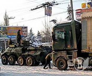 «Фуры» из снега в Чернигове вытягивают бронетранспортером