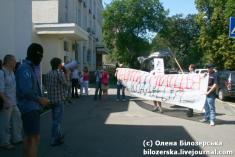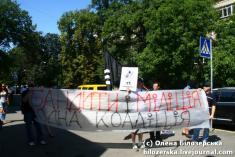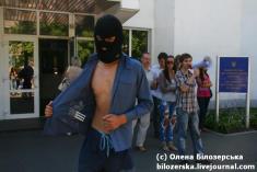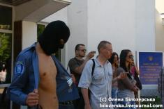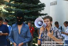 Хлопці тримали гасло "Бандити й міліція - одна коаліція". "Міліціонер", при шевроні і з чорною маскою на голові, розпахував поли блакитної сорочки, вдягненої на голе тіло (разоблачєніє!) - зсередини на сорочці були закріплені шприци - і пропонував усім купити в нього наркотики.