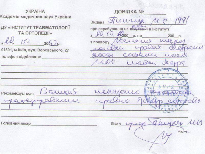 Була направлена на консультацію в Київський Інститут травматології та ортопедії. На консультації у професора Полулях Михайла Васильовича рекомендовано негайне протезування правого суглоба стегна.