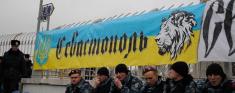Севастополь. ПФК «Севастополь». В Севастополе достаточно большое количество фанатов пророссийского толка. На трибунах можно увидеть даже сербские флаги. Но и здесь не все просто... На футбол с флагом Военно-Морского Флота Украины (слева внизу)