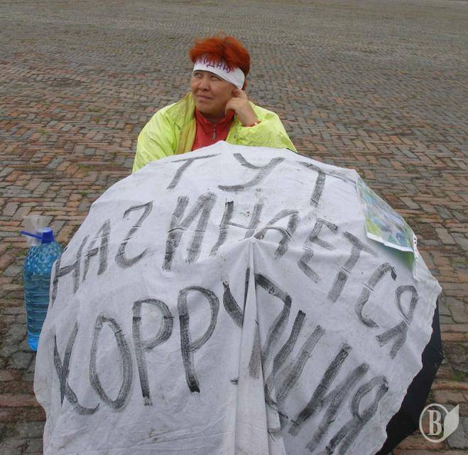 За пікетами під міською радою люди зовсім не помітили жінку, що сидить посеред площі. Біля неї надпис «Корупціонери», а на голові пов’язка «ГОЛОДАЮ».