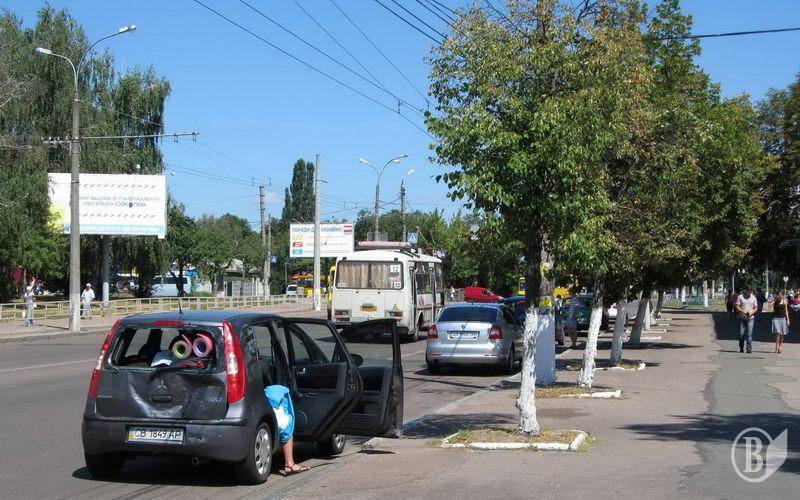 Пригода сталася відразу за зупинкою громадського транспорту біля Театру ляльок, навпроти адмінбудівлі Чернігівських електромереж. Маршрутне таксі 33-го маршруту (держномер СВ2564АІ) ударило легковик (держномер СВ1849АР) ззаду, зім'явши задні двері і розбивши скло.