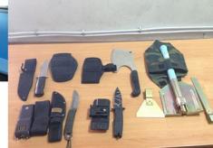 В результате обзора в передних дверцах автомобиля, со стороны пассажира, обнаружено электрошоковое устройство «Jsj-609». Но эта находка не стала единственной. В личных вещах водителя и пассажира обнаружены три ножа, одна саперная лопатка с переменными насадками и нож для обработки мяса. Все вещи изъяты.
