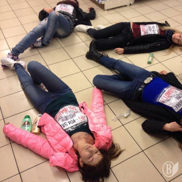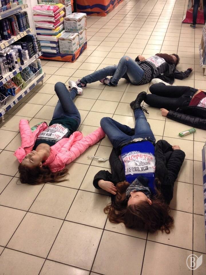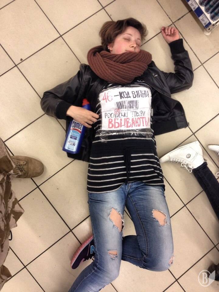 Несколько молодых девушек с прикрепленными поверх одежды плакатами, содержащими надписи «46 – код войны. Российские товары убивают!» падали на пол торгового зал, демонстрируя таким образом, свой протест против политики России в отношении Украины.