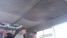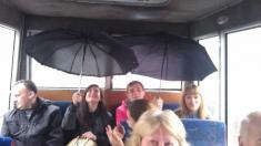 Второе – сиденья, точнее их подобие. Обивка порвана, кое-где вываливаются куски поролона, в некоторых погнутые спинки упираются тем, кто сидит сзади, в колени. Всю эту живописную картину дополняет вода, которая льется с потолка.