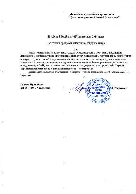 Призначення платежу: «Безповоротна фінансова допомога на акцію «Врятуймо добру людину. Заяц Андрій.