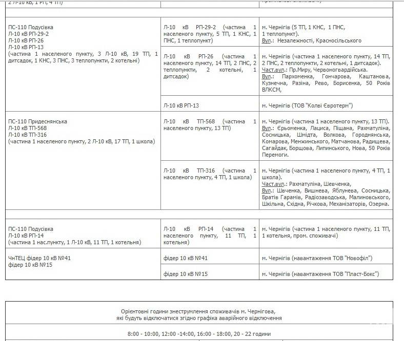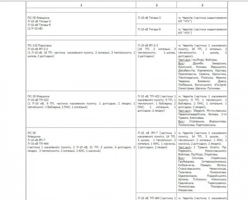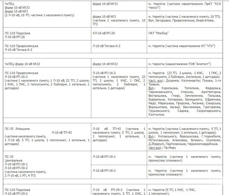 ПАТ"Черниговоблэнерго"опубликовала полный список черниговских улиц, на которых будут отключать электроэнергию.