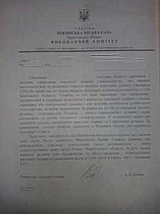 Ініційоване ж Чернігівською облдержадміністрацією доручення щодо підтримки членів сімей учасників АТО в частині звільнення їх від сплати за житлово-комунальні послуги на час проведення антитерористичної операції на сході країни отримало підтримку низки райдержадміністрацій та органів місцевого самоврядування. Лише у цьому списку чомусь немає Ніжинської міськради. Жодних рішень про надання пільг для учасників АТО не ухвалено й досі.