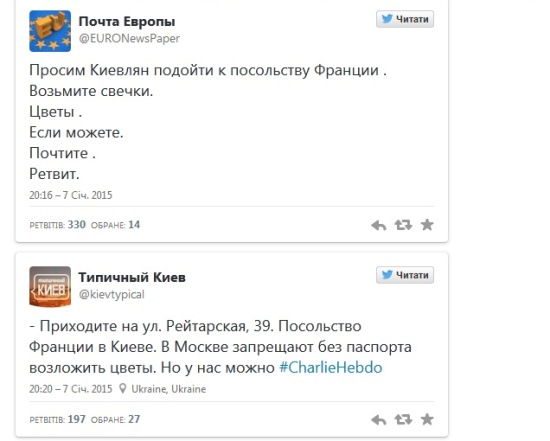 Українці у соцмережах активно поширюють адресу посольства Франції у Києві. Таким чином, небайдужі українці закликають киян та гостей міста вшанувати пам'ять жертв теракту у Парижі та принести до приміщення посольства свічки, лампадки та квіти. Зауважимо, що посольство Франції у Києві розміщене за адресою Райтарська, 39.