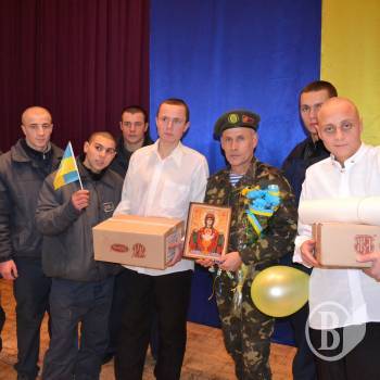 Керівництво Прилуцької виховної колонії подякували гостю за цікаву розповідь і вручили українським воякам подарунки-обереги – солодощі, малюнки та ікони для передачі їх захисникам Батьківщини в зоні АТО.