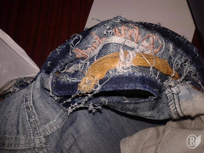 Наступний фрагмент медичного бинту світло-коричневого кольору з різким запахом ацетону було виявлено при спробі передачі у чоловічих джинсових брюках.