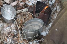 Наші чернігівські воїни –«афганці» дістають похідні пристрої – готують чай і підігрівають кашу на вогні, якого не видно. Все за законами війни.