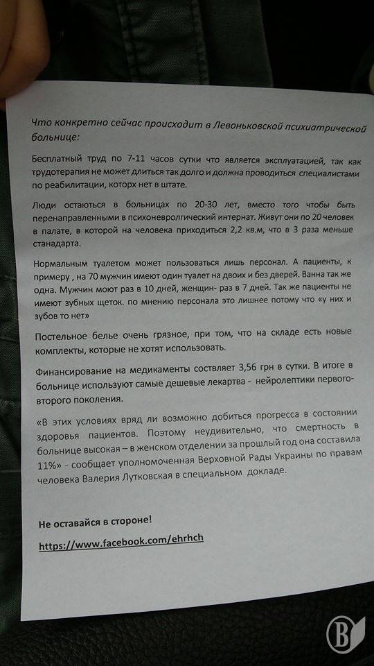 Систематичні та разючі порушення прав пацієнтів були виявлені громадськими моніторами Національного превентивного механізму спільно з представниками Офісу омбудсмена під час візиту до Левоньківської психіатричної лікарні, який відбувся 16.07.2015 р.