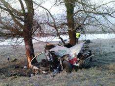 На большой скорости авто слетело в кювет, где и столкнулось с придорожным деревом. В результате сильного удара автомобиль сильно смяло и разорвало.