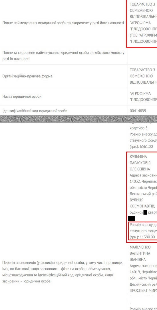 Жена судьи Парасковия Кузьмина владеет частью ООО «Агрофирма «Плодоовочпром» (8,87%). Размер ее взноса в уставной фонд предприятия составляет 11 тыс грн. Фирма, основным видом деятельности которой является оптовая торговля фруктами и овощами, зарегистрирована в Чернигове. Одним из соучредителей общества есть Василий Тютин – директор Черниговского научно-исследовательского центра производительности АПК (17,22%).
