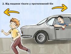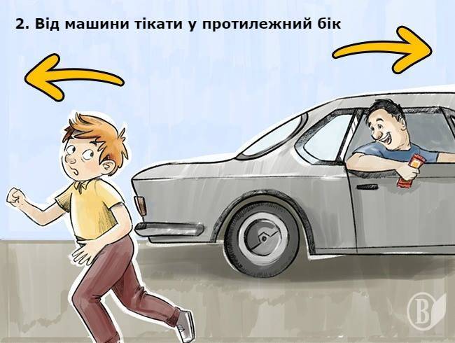 2. Батьки вчать дітей не сідати в машину до незнайомців – це правильно. Нехай дитина засвоїть ще одне правило: якщо біля неї загальмувала машина або авто їде слідом і хтось із неї намагається привернути увагу дитини, треба швидко втікати у протилежний бік від руху автомобіля. Це допоможе виграти час і звернутися за допомогою.