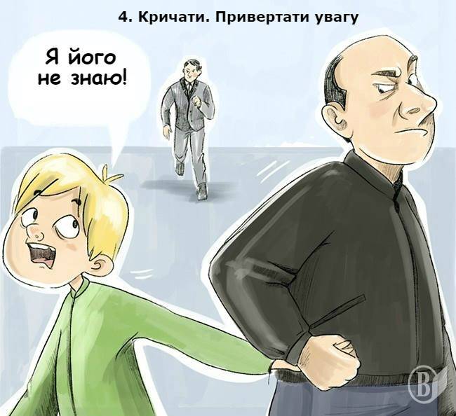 4. Скажіть дитині, що якщо його схопив незнайомець, то можна і навіть потрібно кусатися, штовхатися, дряпатися й будь-що привертати до себе увагу. Треба голосно кричати: «Я його не знаю! Він хоче мене викрасти!»