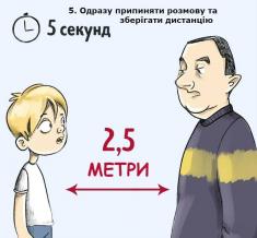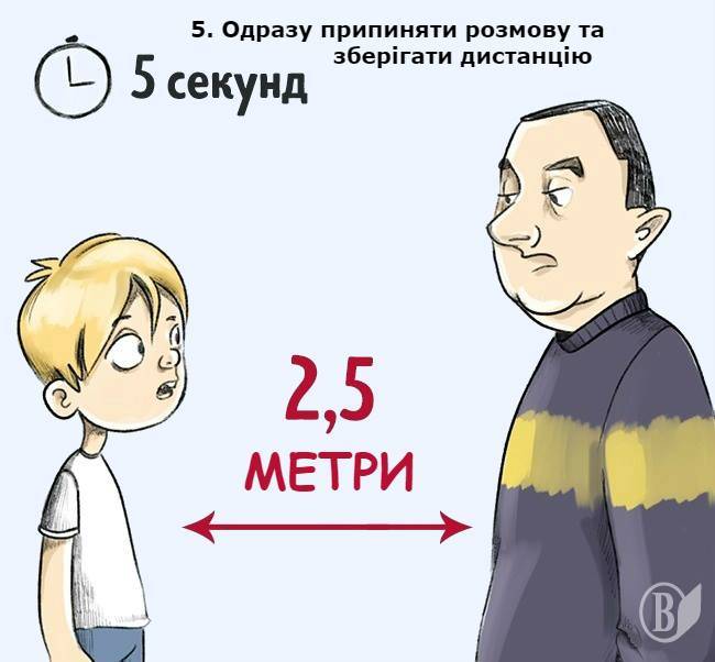 Стояти під час розмови слід на відстані 2-2,5 метрів від незнайомця, а якщо він наближатиметься, необхідно зробити крок назад. Разом із дитиною продумайте цю ситуацію, покажіть дистанцію в 2 метри і попередьте, що під час бесіди її потрібно зберігати.