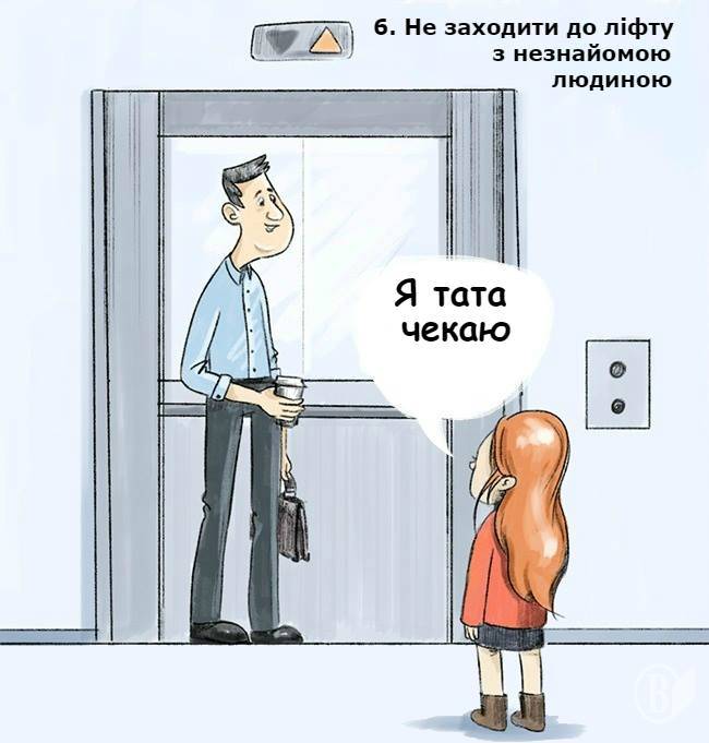 6. Навчіть дитину чекати ліфт таким чином, щоб бачити всіх, хто до нього підходить (наприклад, спиною до стіни). І якщо це незнайомець або хтось малознайомий, під будь-яким приводом не заходити з ним у ліфт: робити вигляд, що щось забув, або йти до поштової скриньки.