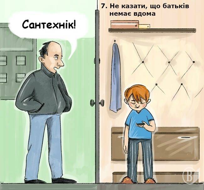 Не можна говорити, що батьків немає вдома, навіть якщо незнайомець представляється їхнім другом чи працівником комунальних служб. Якщо він дуже наполегливий і ломиться в квартиру, треба терміново телефонувати батькам, сусідам або в поліцію за номером 102.