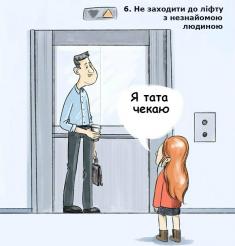 Якщо хтось запрошує зайти, найкращий варіант – це ввічливо відповісти, що батьки дозволяють їздити в ліфті лише одному або зі знайомими сусідами. Якщо незнайомець намагається затягнути її в ліфт або закрити їй рота, потрібно битися, кусатися й кричати.