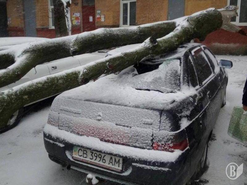 Сьогодні, 18 грудня, дерево впало і пошкодило легковик ВАЗ В Чернігові у дворі будинку на проспекті Миру, 55.