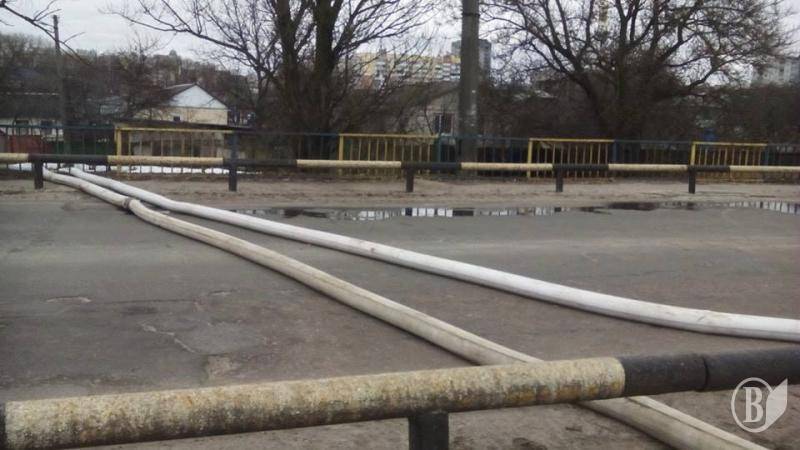 На дамбі річки Стрижень на вулиці Київській для додаткового пониження рівня талих вод сьогодні проводиться перекачка води за допомогою наземного обладнання. Воно перетинає проїжджу частину.