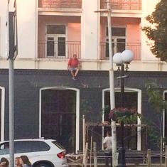 При цьому перед падінням він був вдягнений у червону футболку і шорти, а коли вже впав, то опинився у чорній футболці та штанях, схожих на джинси.