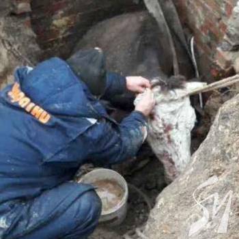 Спільними зусиллями рятувальники і місцевий люд вивільнили корівку трактором за допомогою спецзасобів з каналізаційної ями.