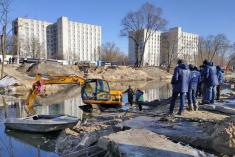 З річки Стрижень біля Красного мосту витягають екскаватор, що вчора затонув після підтоплення тимчасової дамби.