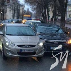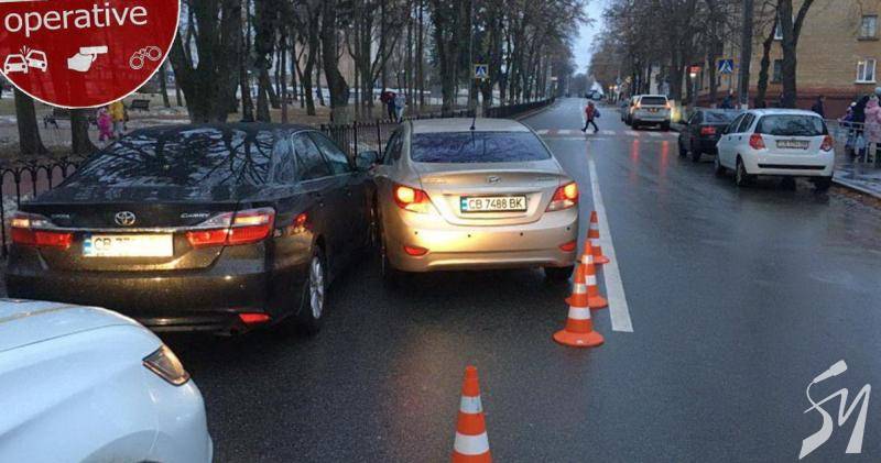 Два водії легковиків з номерами Чернігівської області не змогли поділити смугу руху на під’їзді до пішохідного переходу до школи №3 в центрі Чернігова на вул. Гетьмана Полуботка.