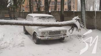Від мокрого снігу решта дерев зігнулися та зависли на електричних дротах. Одна з туй впала на припаркований легковий автомобіль.