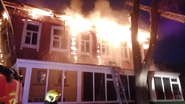 «По прибуттю пожежно-рятувального підрозділу до місця виклику було виявлено, що відбувається горіння покрівлі та офісних приміщень двоповерхової будівлі (20х15) по всій площі. В 19.17 пожежу було локалізовано. За словами очевидців, вогонь охопив значну частину будівлі. Про постраждалих не повідомляється ».