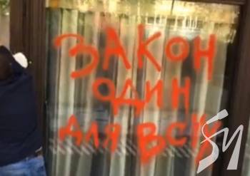 На склі «блокувальники» написали фарбою «карантин» та «закон один для всіх».