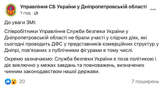 При цьому управління СБУ в Дніпропетровській області заявляє, що його співробітники не брали участь в обшуках. "Співробітники Управління Служби безпеки України в Дніпропетровській області не брали участі в слідчих діях, які сьогодні проводить ДФС у представників комерційних структур в Дніпрі, пов'язаних з публічними фігурами зокрема", - сказано в повідомленні на їхній сторінці в Фейсбуці.