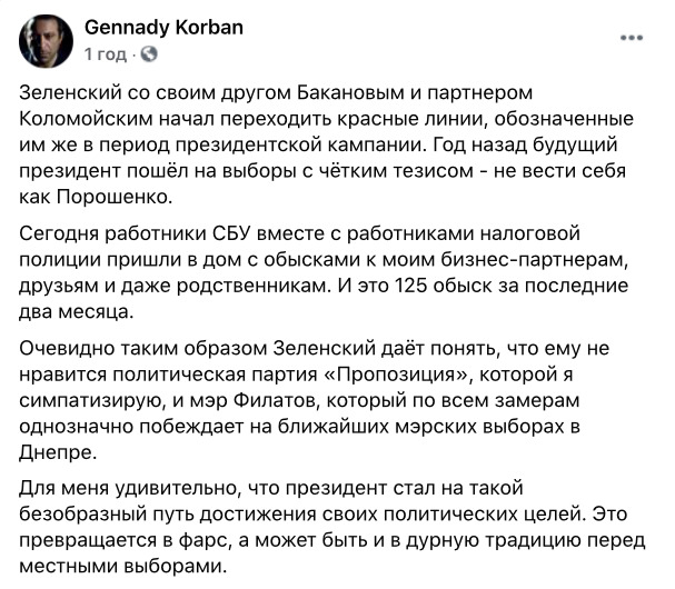 Глава громадської ради Дніпра Геннадій Корбан заявляє, що у його родичів, друзів і бізнес-партнерів відбуваються масштабні обшуки. За його словами, обшуки почалися після того, як партія "Пропозиція" не погодилась на пропозицію "Слуги народу" зняти кандидатуру Бориса Філатова на місцевих виборах.Джерело: https://censor.net.ua/ua/n3212382