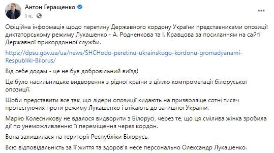"Від себе додам - це не був добровільний виїзд! Це було насильницьке видворення з рідної країни з ціллю компрометації білоруської опозиції. Щоби представити все так, що лідери опозиції кидають на призволяще сотні тисяч протестуючих проти режиму Лукашенко і втікають до затишної України", - заявив Геращенко.