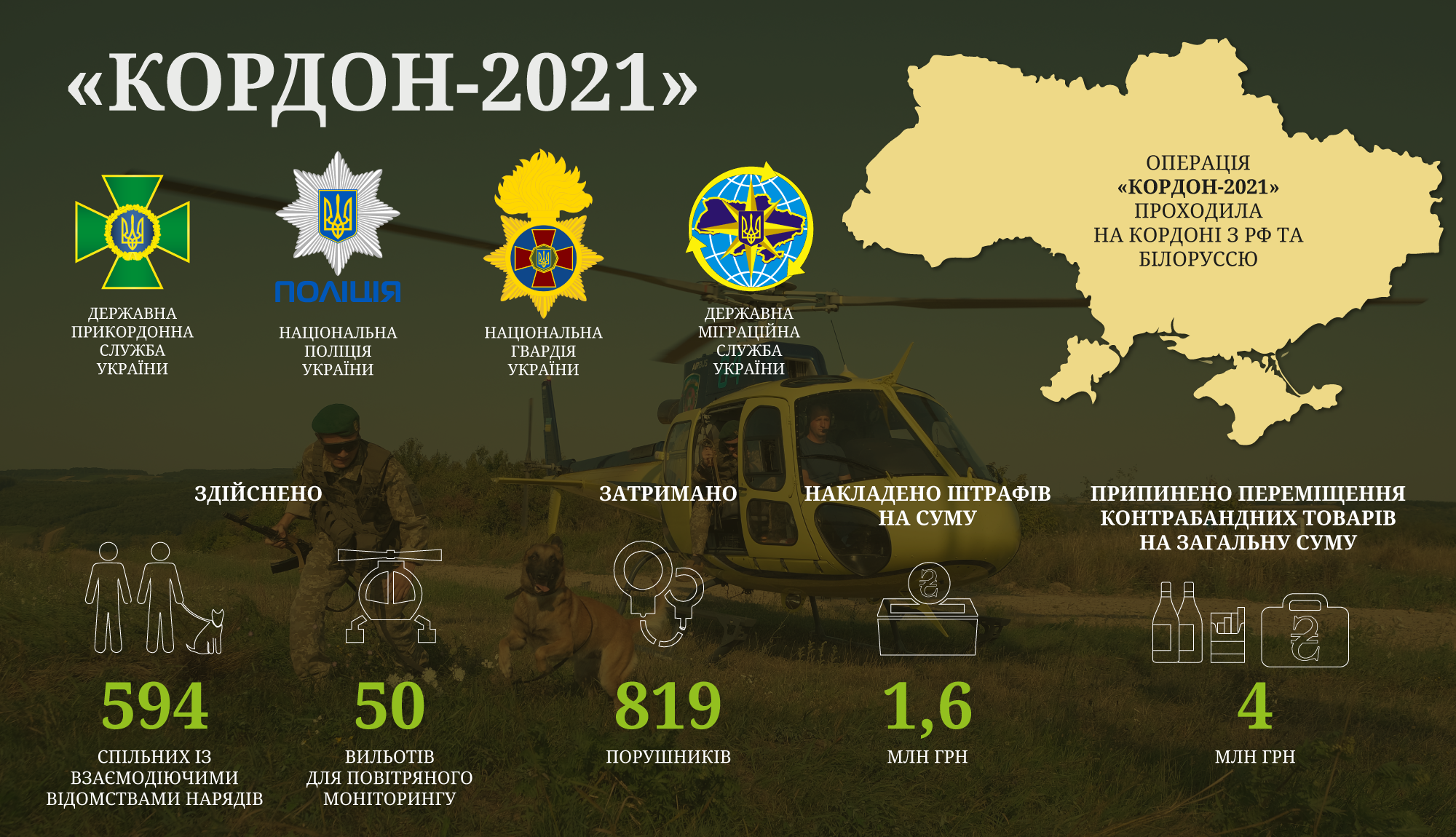 У Держприкордонслужбі України підбили підсумки операції «Кордон-2021», яка у вересні-жовтні проходила на кордоні з РФ та Білоруссю. Спільна прикордонна операція «Кордон – 2021» проводилась силами та засобами Держприкордонслужби спільно з органами та підрозділами Національної поліції, Національної гвардії та Державної міграційної служби України.