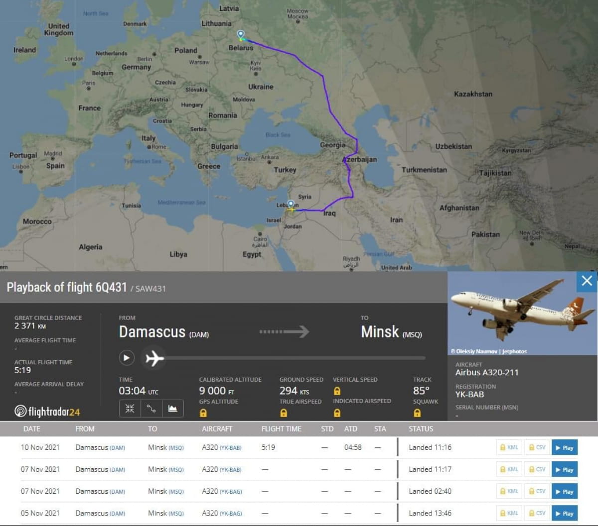 За останні 7 діб сирійська компанія Cham Wings Airlines здійснила чотири прямі рейси з Дамаску в аеропорт Мінська. Найбільша активність перельотів була саме 7 листопада – напередодні загострення ситуації на польсько-білоруському кордоні. Про це мовиться в матеріалі міжнародної розвідувальної спільноти InformNapalm, передає 5.ua.