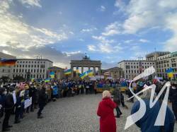 Учасники демонстрації закликали німецький уряд використати свій вплив на Росію, щоб зупинити нову російську агресію проти Києва.