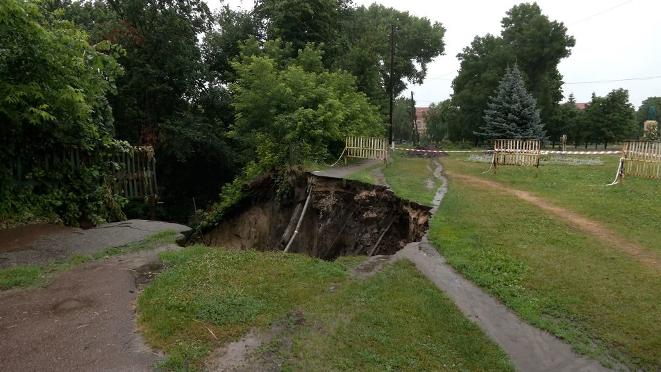 Яр у центрі міста почав утворюватись ще місяць тому. Після першого дощу впала огорожа над тротуаром. Після другого дощу – впав сам тротуар.
