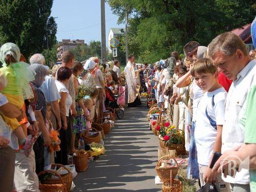 Около храма собралась больше тысячи мирян с красиво украшенными корзинами яблок, груш, винограда, овощей и мёда, которые освящались священниками, обрызгивались свячёной водой.