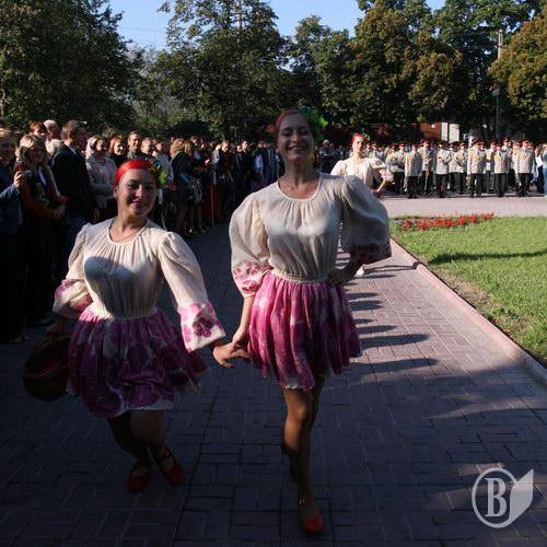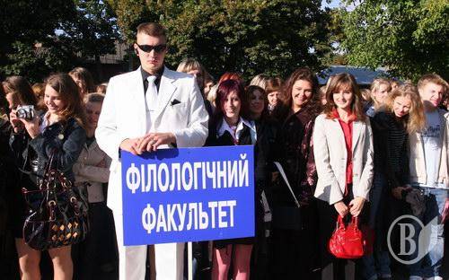 На цьому цікавинки не завершились. Далі першокурсників традиційно привітав ректор. А потім – новий музичний гурт «Хлопці ЧДПУ», який складається з 3 досвідчених викладачів, які співали «Вишеньку-черешеньку». А молоді «вишеньки» в український костюмах танцювали і роздавали публіці маленькі подаруночки.